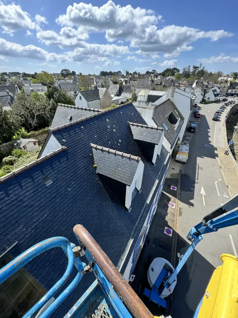 On prend de la hauteur pour ce chantier à Arzon. Et quelle vue sur la mer en-haut de la nacelle ! Un beau chantier comme on les aime chez Neoty : nettoyage toiture et façade pour un résultat nickel de haut en bas.